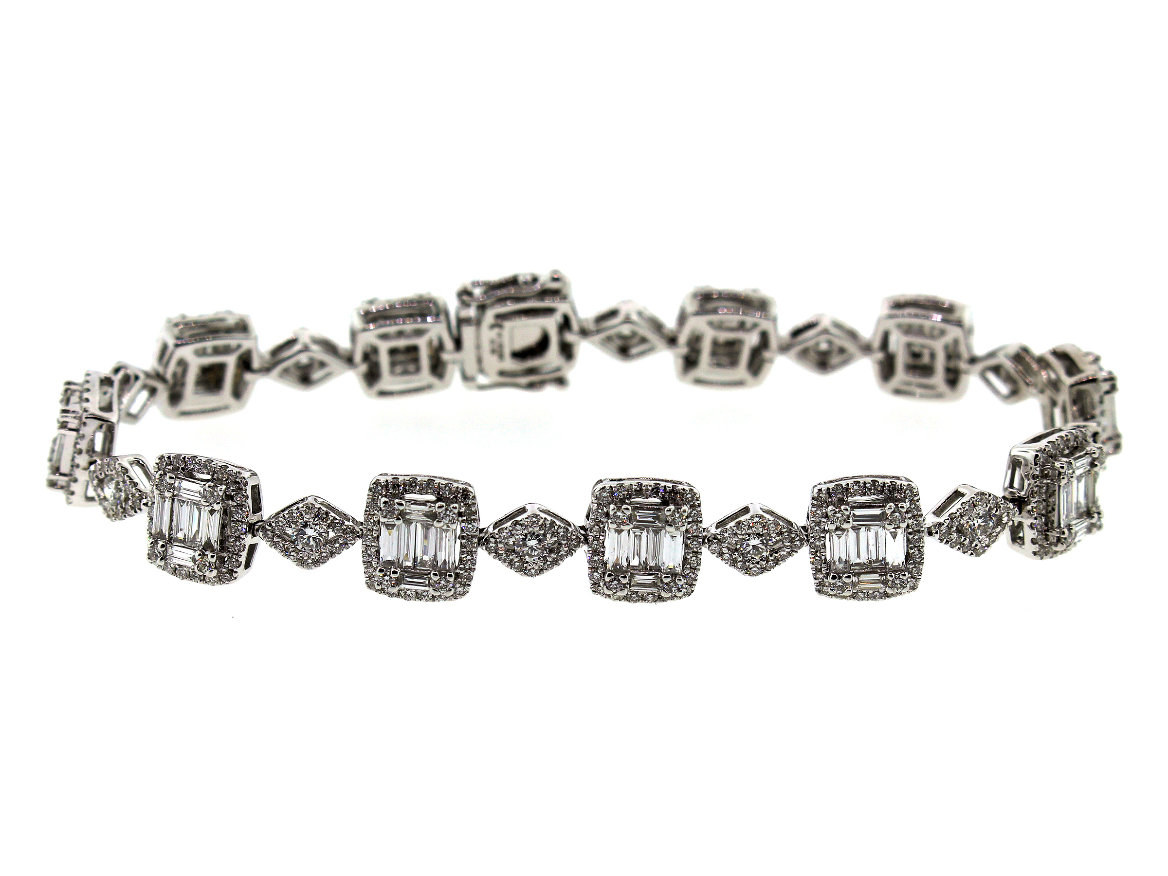 Modern take on the classic tennis bracelet. Features Baguette and Round diamonds set in an emerald cut cluster look with diamond halos